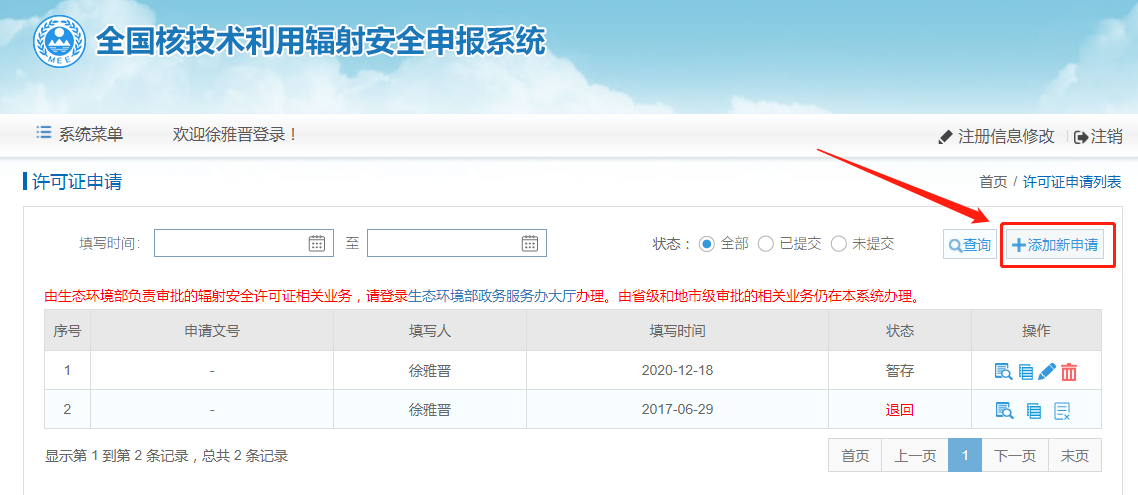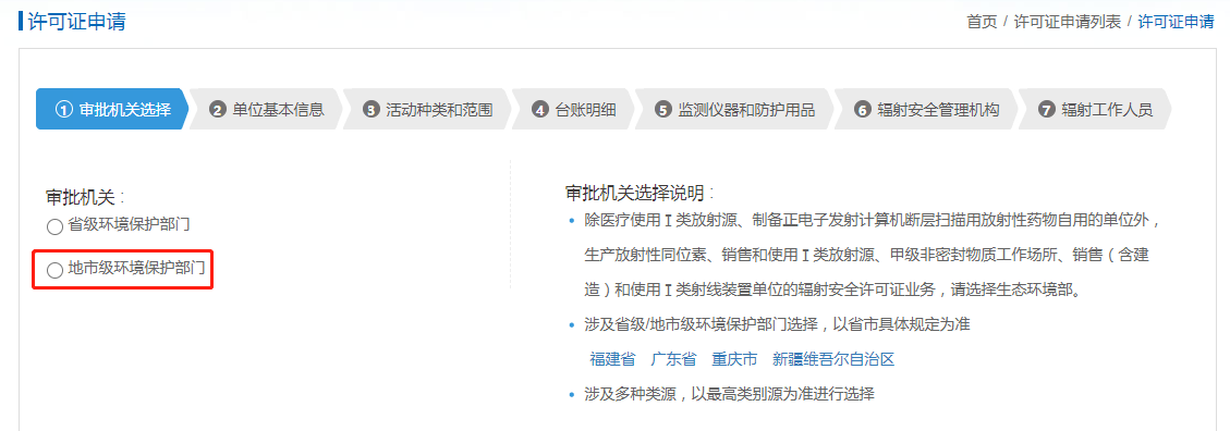 三、登录[全国核技术利用辐射安全申报系统](http://rr.mee.gov.cn/rsmsreq/login.jsp)(rr.mee.gov.cn),在“许可证相关申请”中填写“许可证重新申领”,将【新设备】增加进入台账后,提交到“地市级环保部门”【新设备添加进去,设备状态要填写为“在用”!!!!!!】